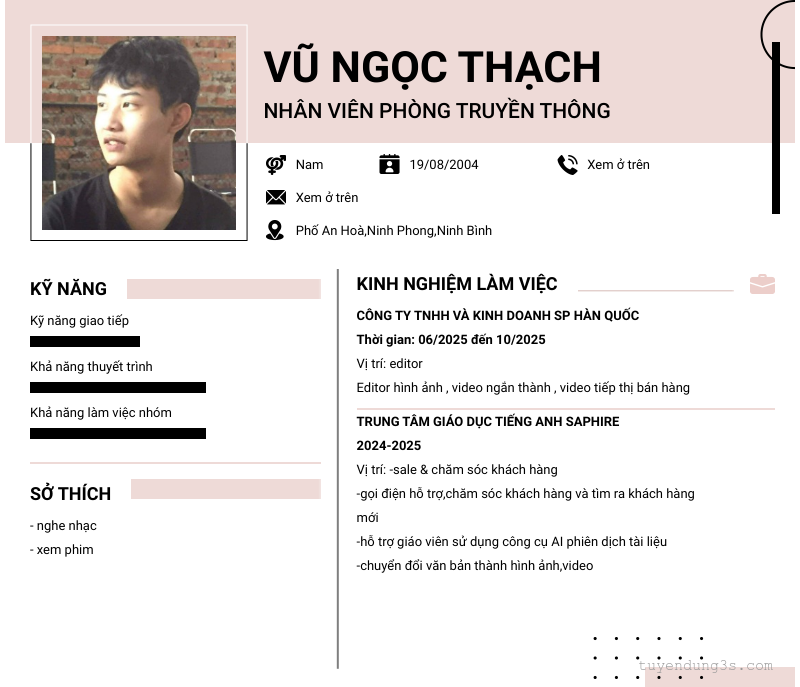 Mở xem thông tin đầy đủ ứng viên Vũ NGọc Thạch chỉ với 2 điểm. Ứng viên được cập nhật ngày 30/10/2025