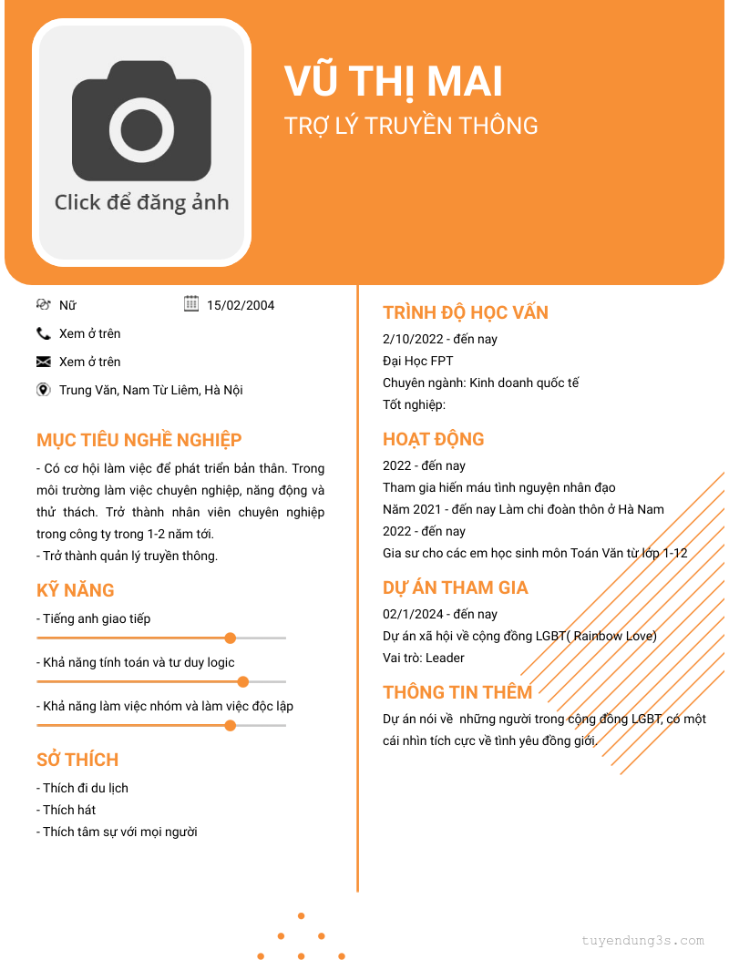 Mở xem thông tin đầy đủ ứng viên Vũ Thị Mai chỉ với 2 điểm. Ứng viên được cập nhật ngày 10/03/2024