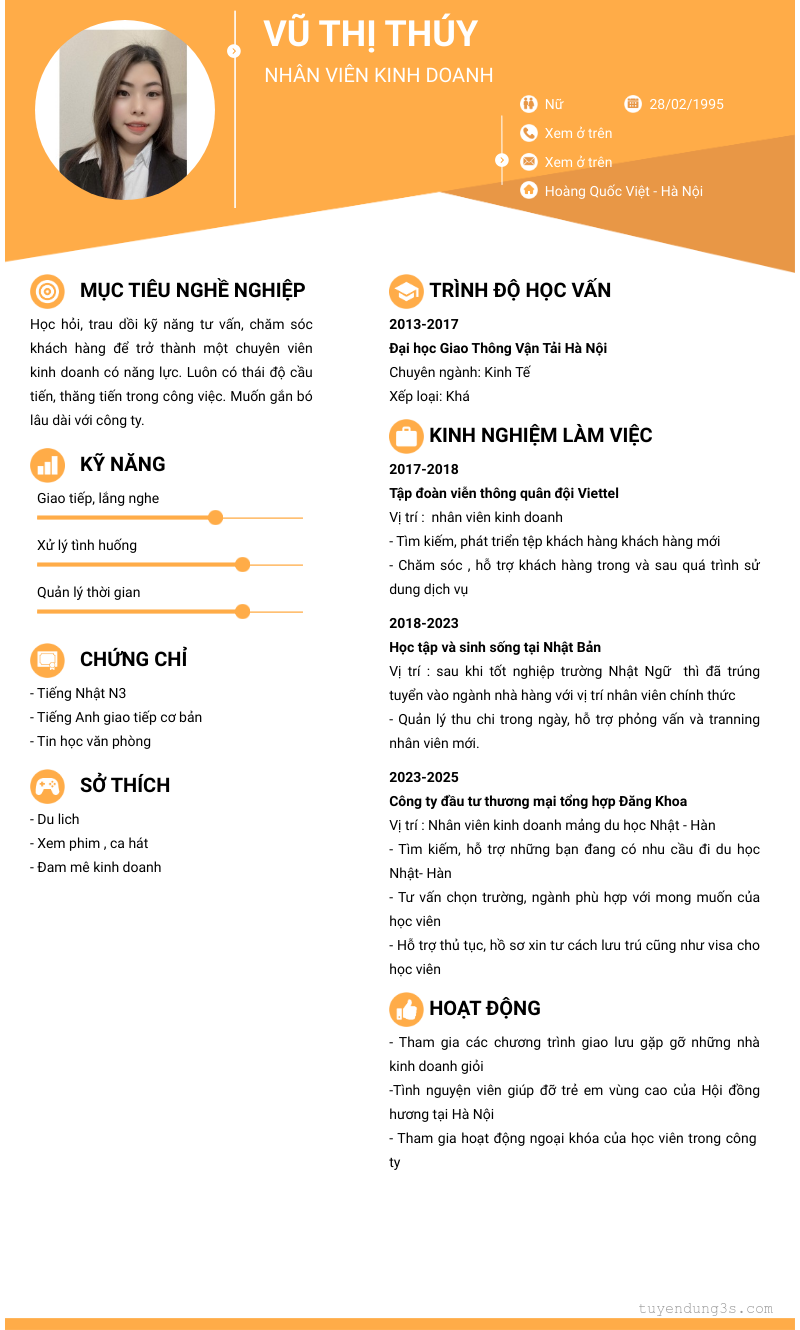 Mở xem thông tin đầy đủ ứng viên VŨ THỊ THÚY chỉ với 2 điểm. Ứng viên được cập nhật ngày 17/09/2025