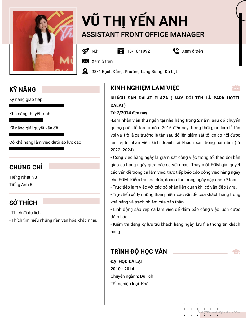 Mở xem thông tin đầy đủ ứng viên Vũ Thị Yến Anh chỉ với 2 điểm. Ứng viên được cập nhật ngày 13/03/2026