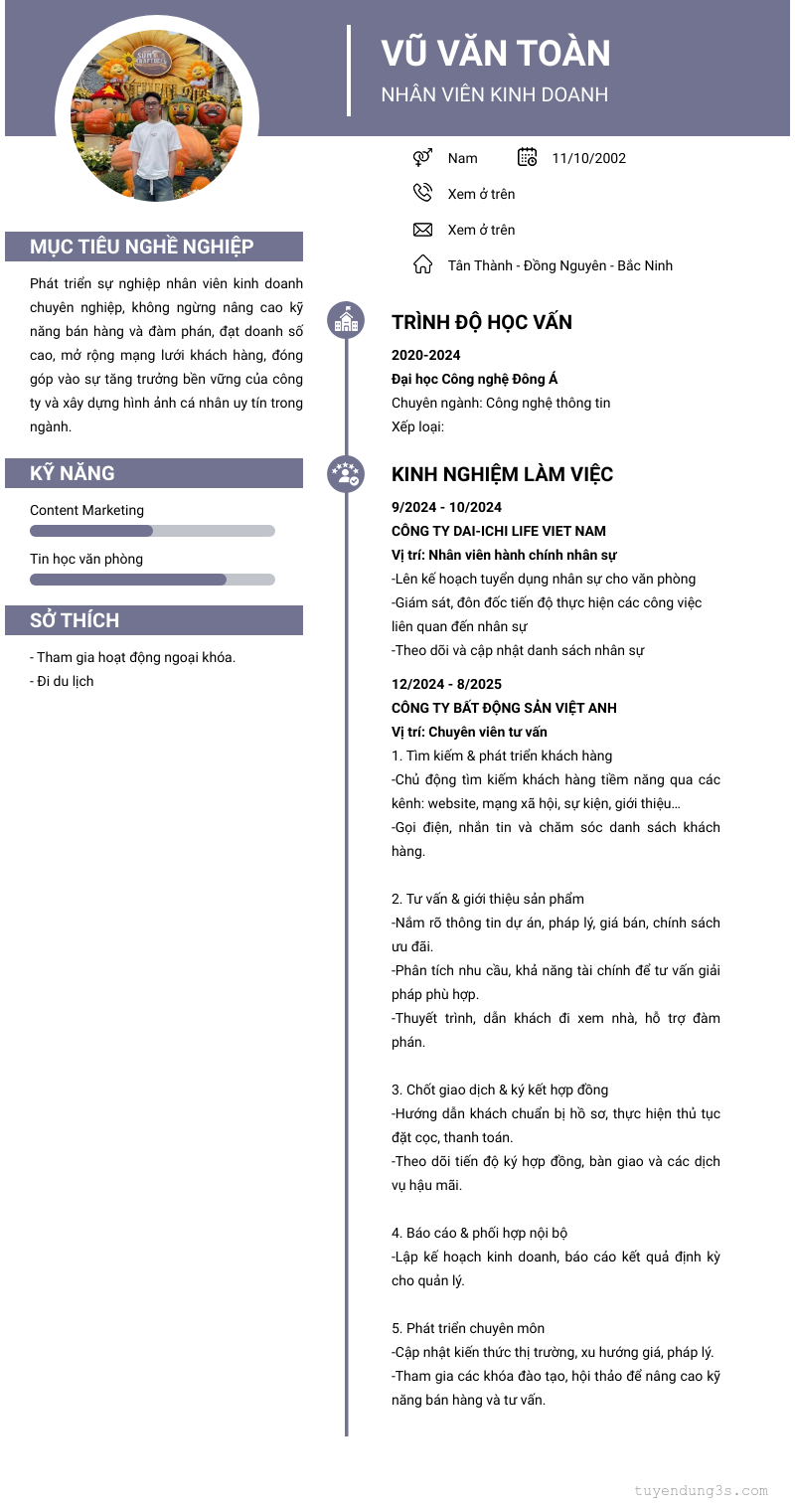 Mở xem thông tin đầy đủ ứng viên Vũ Văn Toàn chỉ với 2 điểm. Ứng viên được cập nhật ngày 24/09/2025