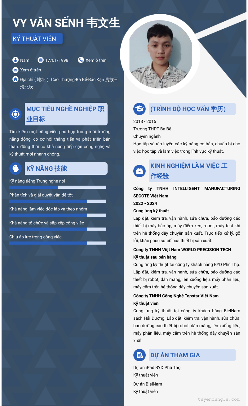 Mở xem thông tin đầy đủ ứng viên VY VĂN SẾNH 韦文生 chỉ với 2 điểm. Ứng viên được cập nhật ngày 08/12/2025