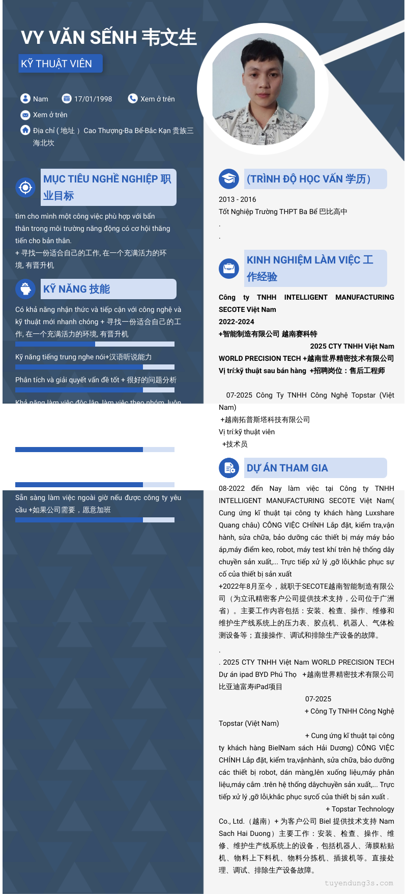Mở xem thông tin đầy đủ ứng viên VY VĂN SẾNH 韦文生 chỉ với 2 điểm. Ứng viên được cập nhật ngày 24/12/2025